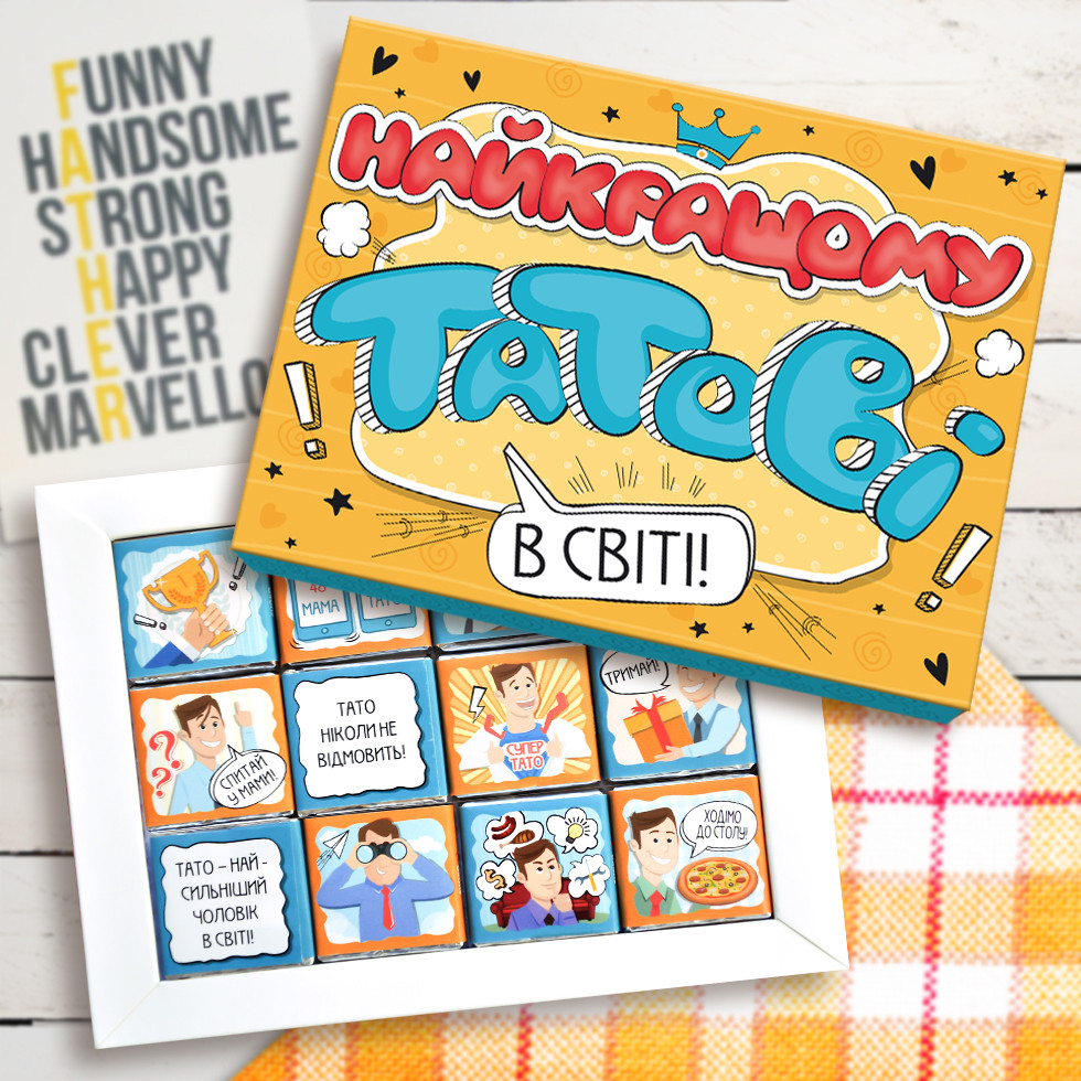 Оригінальний шоколадний набір для найкращого тата. Веселі ілюстрації та коментарі змусять посміхнутися, а смачний шоколад підійме настрій будь-якому татові.